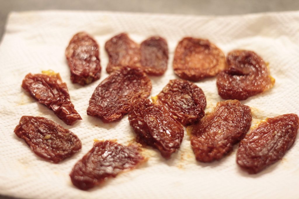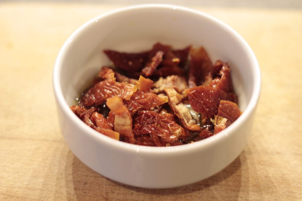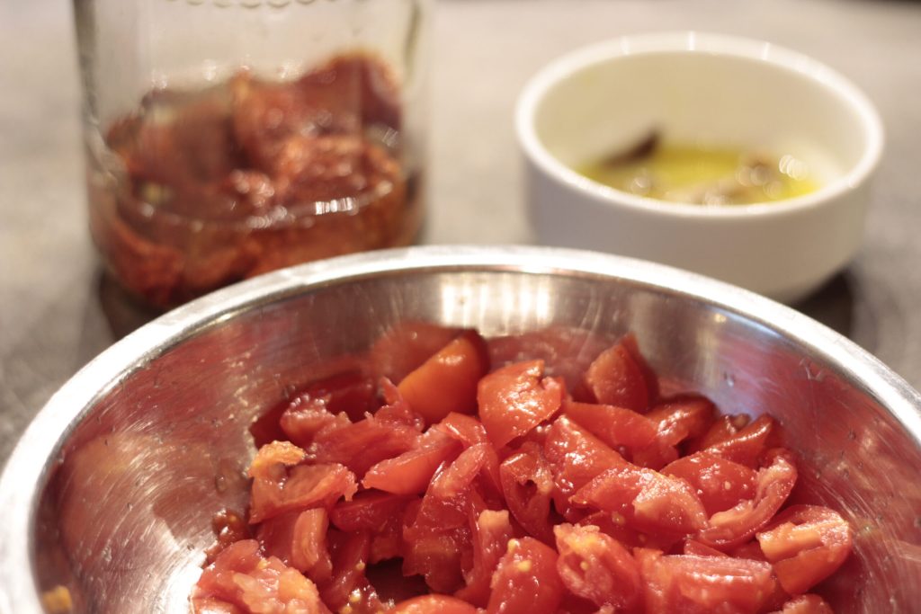 • Primero, ponga los tomates secos en agua hirviendo, justo el tiempo de cortar los tomates cherry frescos que los secos estarán listos y suavizados.