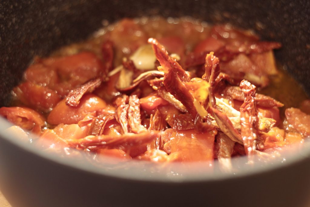 • En una sartén, coloque dos cucharadas de aceite con el ajo y las anchoas, deje dorar durante cinco minutos y agregue los tomates cherry frescos y los tomates secos ya cortados.