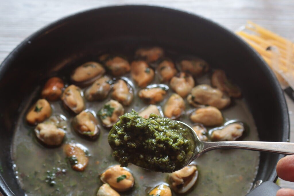 Cocina los mejillones durante diez minutos a fuego medio y después de evaporar el vino, apaga el fuego y añade el pesto.