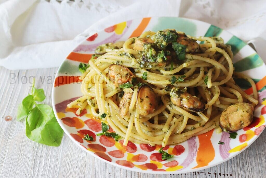 Espaguetis con mejillones y pesto, un primer plato que nos recuerda al verano, por sus colores e ingredientes. Verano, sol y vacaciones son sinónimo de buena predisposición también en la cocina, cuanto más conocemos los ingredientes, mejor se cocina. Hoy hablamos de moluscos, naturalmente se entienden ejemplares que pertenecen a dos familias, las con cáscara y sin cáscara. Obviamente, de las con cáscara conocemos principalmente los mejillones, las almejas, las navajas, los fasolarios y muchos más. El resto de los moluscos son los sin cáscara: pulpos pequeños, sepias, calamares, calamares gigantes, pulpos y muchos más. Para esta mi receta de hoy he utilizado mejillones congelados y sin cáscara, en el mercado existen muchísimos y de buena calidad, quise probar.