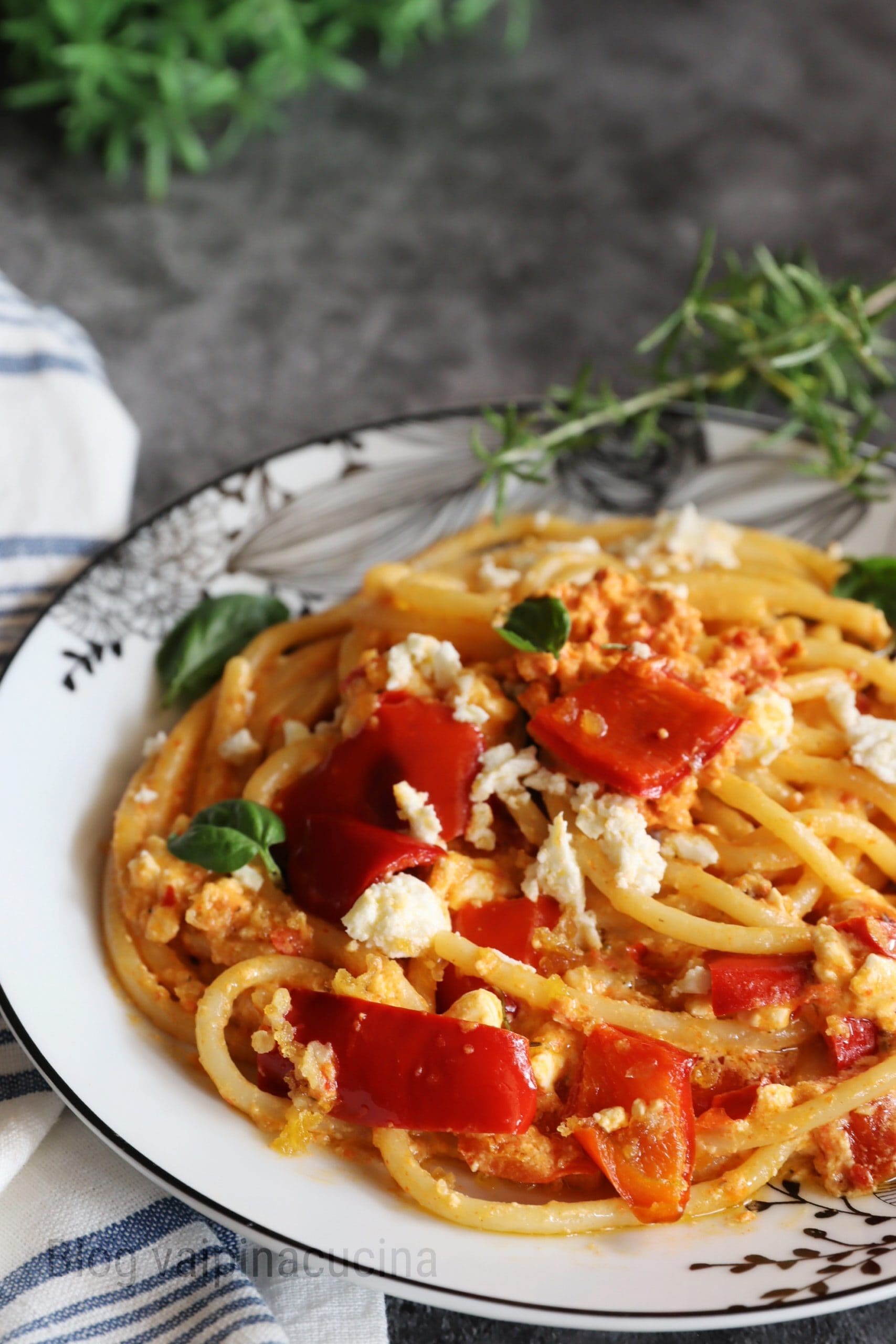 Espaguetis con pimientos y feta al horno, ¿podía no usar esta maravillosa salsa para condimentar los espaguetis? Absolutamente tenía que hacerlo, la cremosidad y dulzura de los pimientos asados con migas de pan y feta con muchas hierbas completan esta fantástica receta. Incluso en domingo, un primer plato condimentado con esta salsa es el almuerzo servido, fresco y ligero, con productos rigurosamente de temporada, el emblema del verano, los pimientos, al igual que las berenjenas.