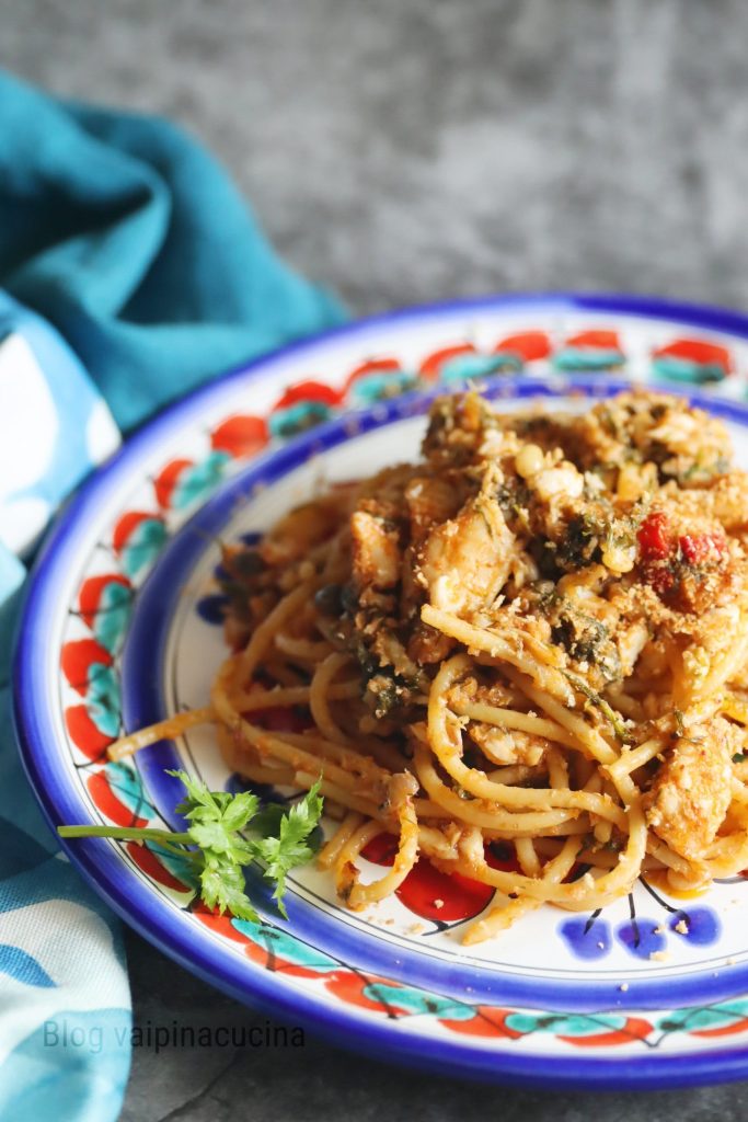 Espaguetis con ragú de salmonetes al estilo de Lampedusa o, si prefieres, ragú de salmonetes con hinojo silvestre y pan rallado tostado. Mi receta es lampedusana, o mejor dicho siciliana, con piñones, alcaparras y pan rallado: no podía ser de otra manera. Como pescado, el salmonete es muy considerado y bien apreciado. El nombre parece derivar de una creencia popular según la cual se pensaba que se reproducía tres veces al año, pero en realidad el período de reproducción es entre mayo y agosto. El período ideal para consumirlos es desde finales del verano hasta diciembre. Conocemos dos tipos de salmonetes: el de fango y el de roca, pero desde el punto de vista nutricional no hay diferencia en cuanto a su procedencia. Ambos son pescados magros con una carne muy delicada y con poco más de 123 calorías por cada 100 gramos. Entre los muchos, uno de los platos de la cocina italiana muy apreciado son los salmonetes a la livornesa, un segundo plato típico toscano, aunque hay muchas recetas, como las de estilo cagliaritano con un condimento a base de hierbas. Seguramente no encontrarás un ragú de salmonetes al estilo lampedusano igual a otro, aunque este plato se asemeja mucho a la pasta con sardinas palermitana. De hecho, son muy similares y se dice que en Lampedusa cuando escasean las sardinas se prepara este plato con salmonetes, buenísimo es decir poco, por eso, para estar seguros, te invito a prepararlo.
