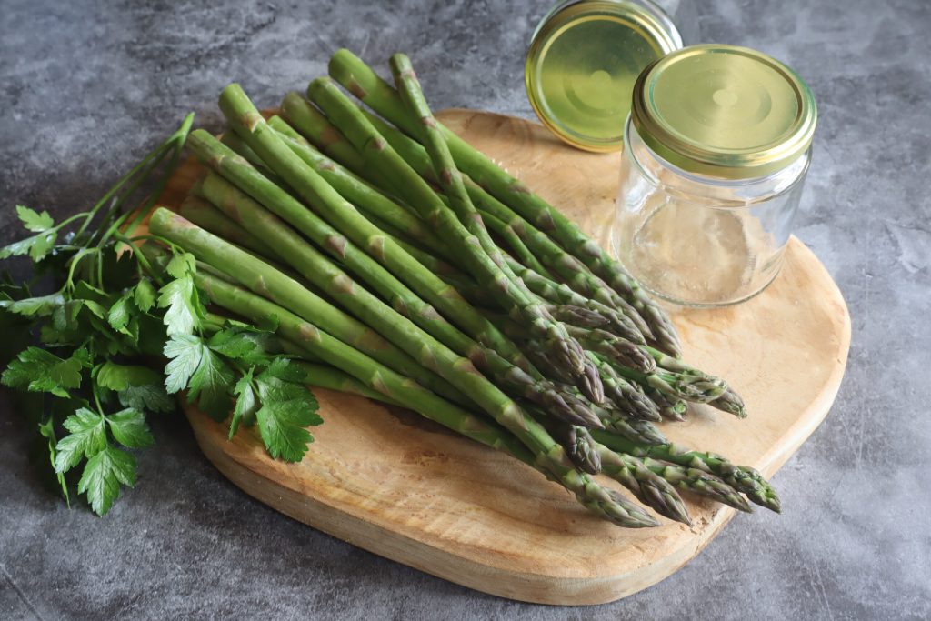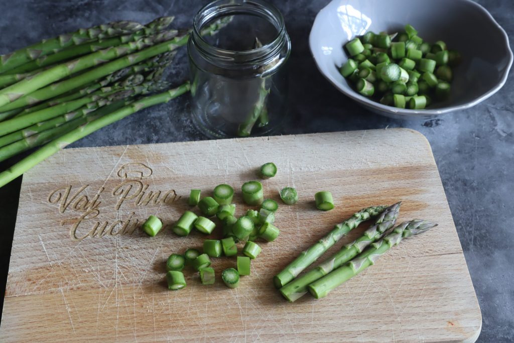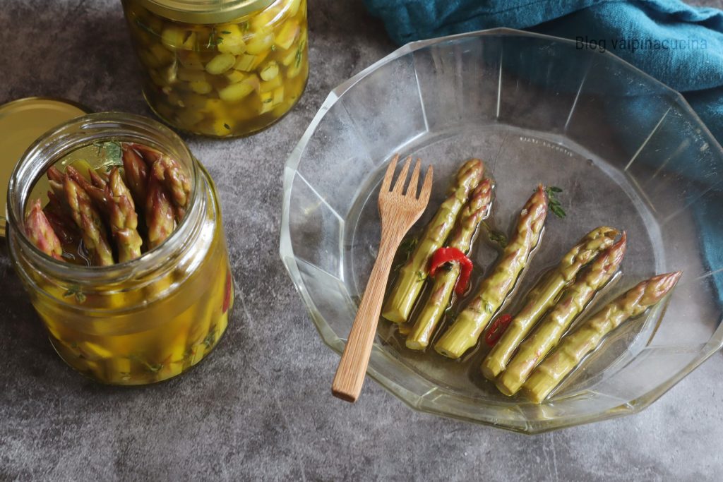 Espárragos en aceite. Hablemos de los espárragos, una planta herbácea también llamada turión. Se consumen solo las flores, ricas en calcio, potasio, fósforo, fibras y hierro, y tienen propiedades depurativas. Los espárragos, al igual que todas las verduras de temporada, tienen un lugar importante en la alimentación y representan una fuente de principios activos perfectos para el organismo gracias a las vitaminas y los antioxidantes. Dan una sensación de saciedad, como todos los vegetales, por el contenido de agua y fibras. Pertenecen a la familia de los lirios y son originarios de Mesopotamia. En el mercado se encuentran espárragos blancos, violetas, verdes, esparraguina y, si tenemos suerte, también los silvestres. El periodo de recolección va de abril a junio, pero para los amantes de esta verdura se pueden encontrar todo el año en el mercado, en la sección de congelados, en tiendas especializadas o supermercados. Pero si queréis, podéis hacerlo vosotros mismos escaldando durante 2 minutos los espárragos, secándolos bien y congelándolos. Hoy, sin embargo, quiero presentaros otro método de conservación de los espárragos, y es ponerlos en aceite.