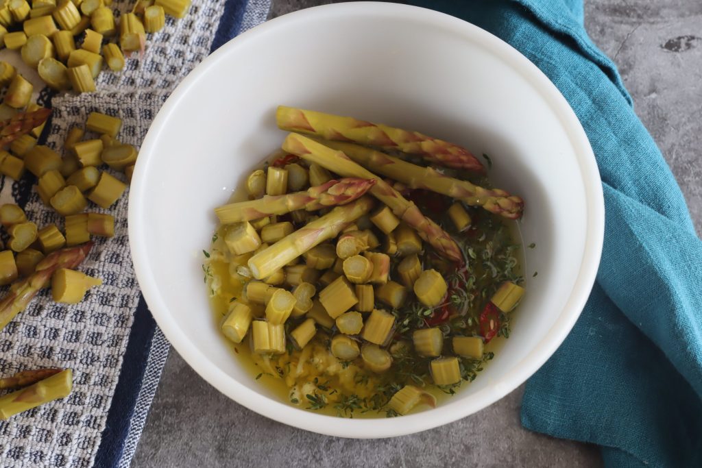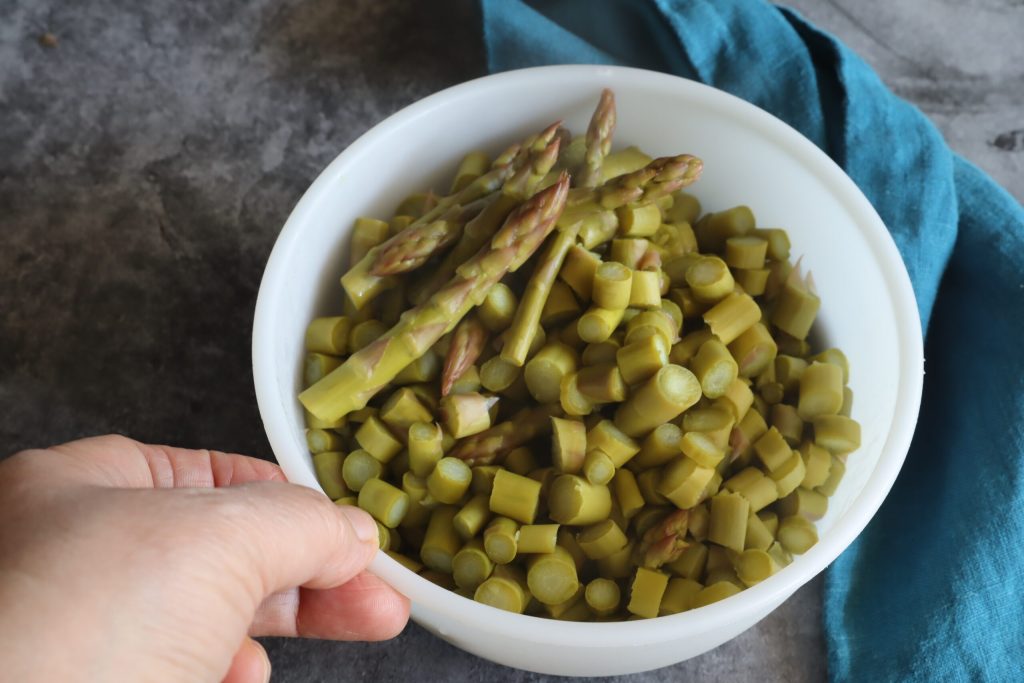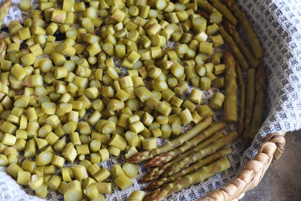 • Lavar y secar los espárragos cortados y listos para ser cocidos.