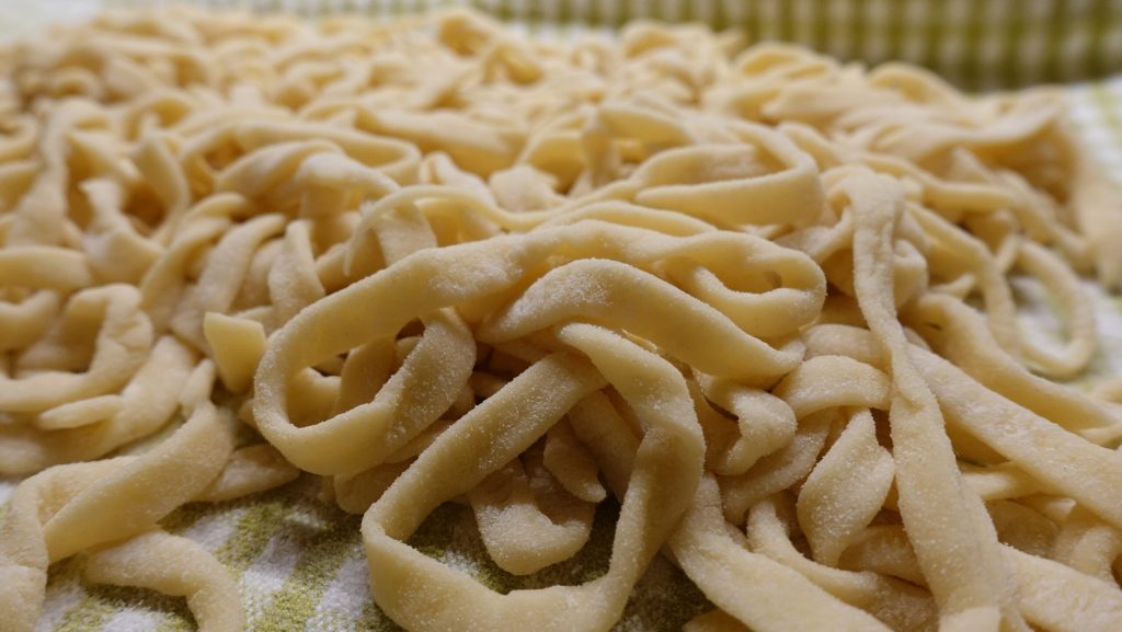 • Las fettuccine caseras están listas, solo falta el ragú de carne. Para la receta del ragú de carne de la abuela Giovanna, os remito a mi blog blog.giallozafferano.it/vaipinacucina.