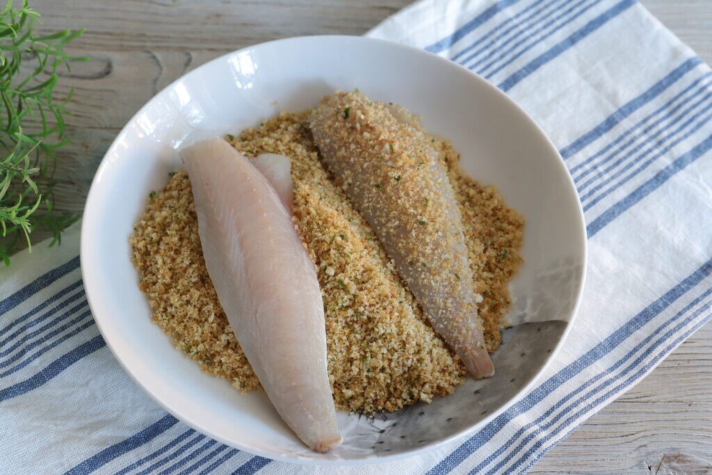 • sin más pasa los filetes de gallineta hasta hacer que el empanado se adhiera al pescado. Gíralos y presiónalos varias veces.