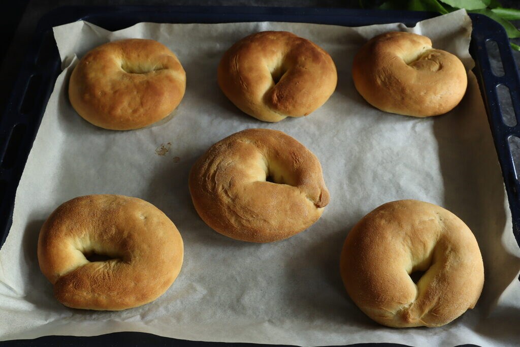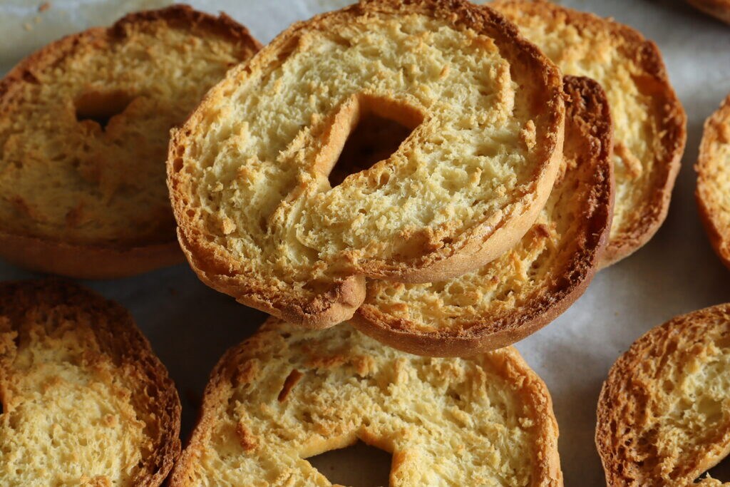 Trabajad cada pieza individualmente formando una cuerda y cerradla en forma de rosquilla, colocad las frisellas en la bandeja con papel de horno separadas entre sí porque duplicarán su volumen.