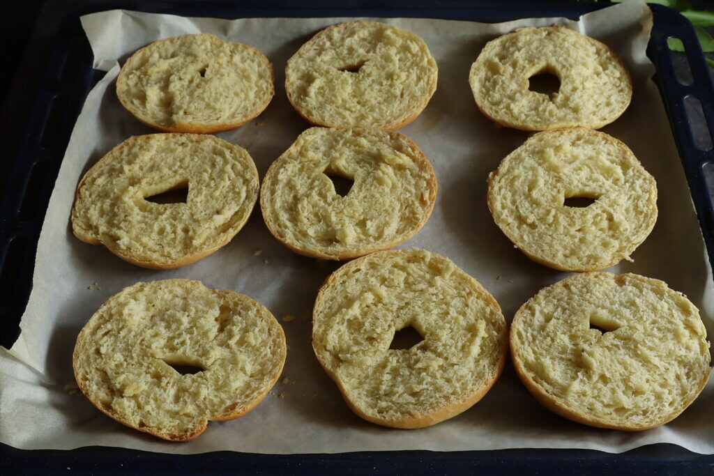 Colocadlas nuevamente en la bandeja (con la parte cortada hacia arriba) y volved a meter al horno durante 20 minutos más a 200° para el tostado.