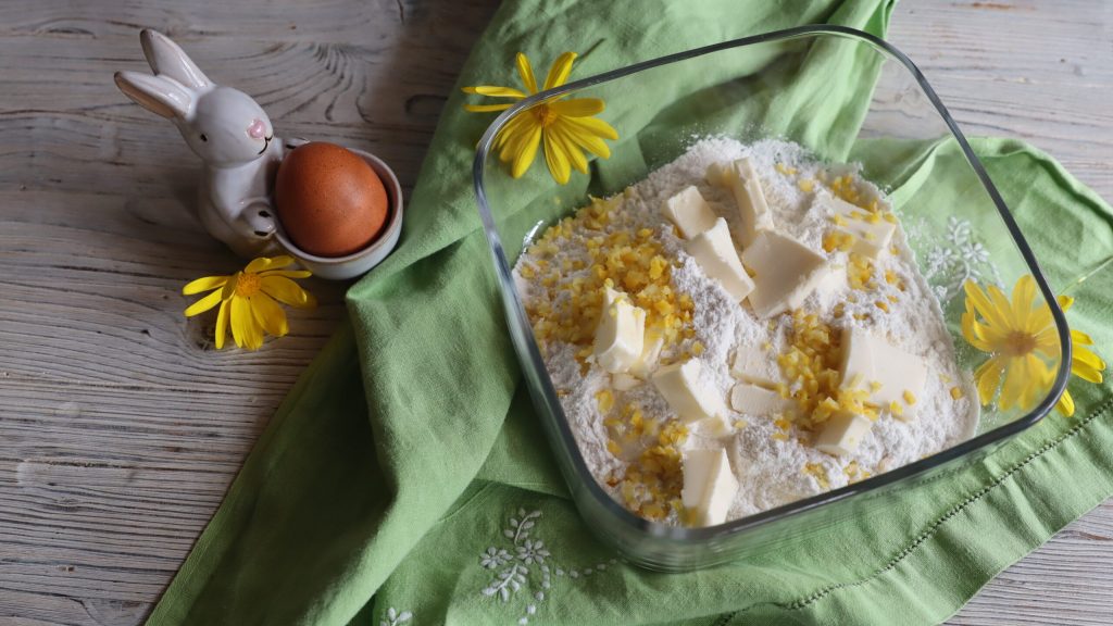 En el bol de vidrio pon la harina de arroz con la mantequilla fría. Con la picadora a cuerda corta la cáscara del limón (bio naturalmente) y agrégala a la mezcla, forma una especie de migas como de masa quebrada.