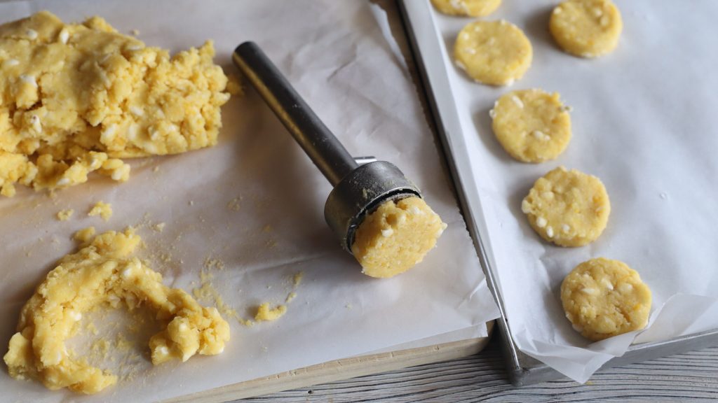 Extiende la masa y saca pequeñas galletas. Yo utilicé mi herramienta para hacer falafel, puedes utilizar un cortapastas pequeño, un cortador de galletas o una tacita de café.