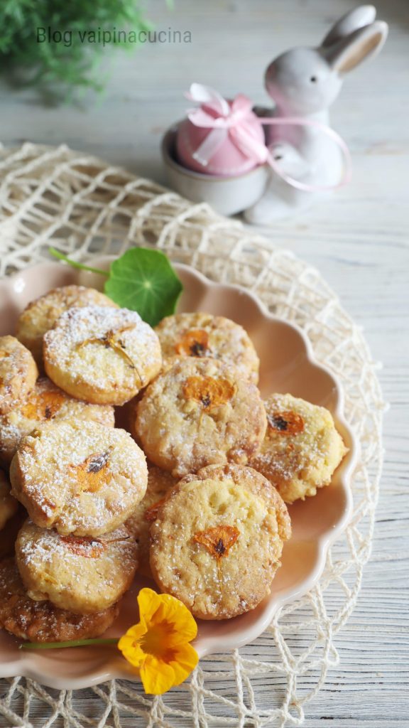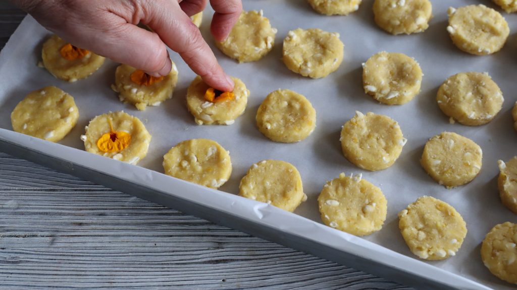 Galletas con harina de arroz y flores de capuchina, una planta comestible que se utiliza en la cocina por sus semillas, hojas y, por supuesto, la flor. Las flores de capuchina son amarillas y naranjas, pero también hay de rojo intenso y crema, delicadamente perfumadas, por lo que son muy queridas por las abejas. Me gusta usar flores en la cocina y, cuando puedo, trato de utilizarlas. También he creado en mi jardín un rincón con flores comestibles: me encanta colorear ensaladas y platos variados. Uso a menudo en mis preparaciones la harina de arroz, un producto que proviene de la molienda del arroz, porque está libre de gluten y, por lo tanto, es ideal para todos, para quienes sufren de celiaquía o son intolerantes al gluten.