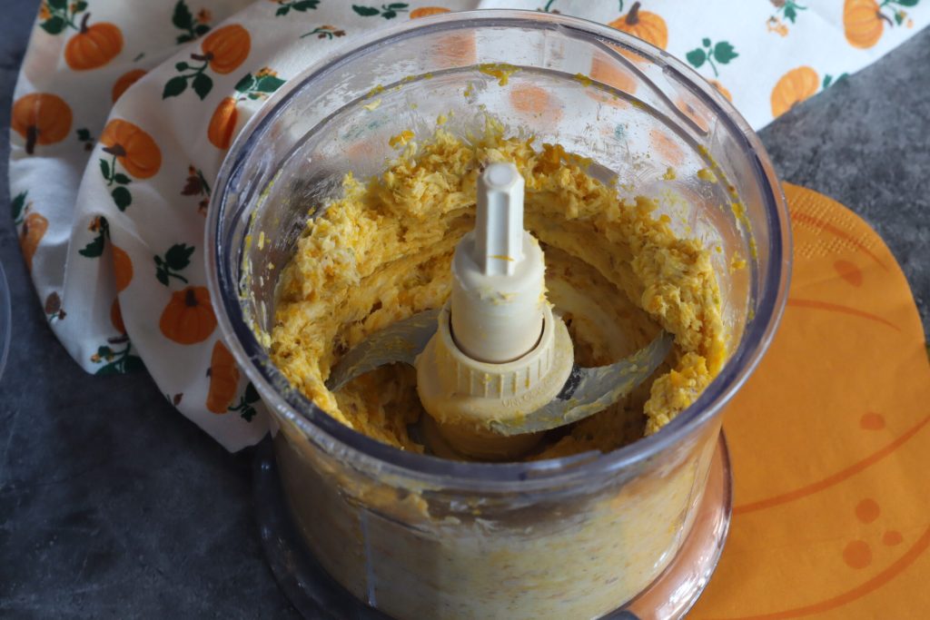 Sacad la mantequilla del frigorífico al menos un par de horas antes de usarla a temperatura ambiente. En la picadora tritura la pulpa de calabaza cocida y añade también la mantequilla y la canela.