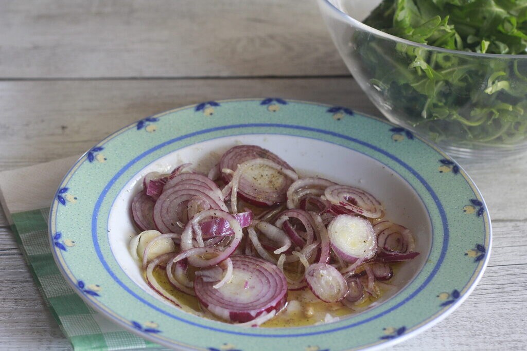 Guarnición de rúcula y cebollas de Tropea, simple, fresca y rápida y obviamente sin cocción. Seguramente ya se ha entendido perfectamente que adoro las cebollas y las agrego en todas partes tanto cocidas como crudas. Las cebollas, principalmente las de Tropea, que son dulces y fácilmente digestibles. Yo las dejo durante veinte minutos en agua que cambio frecuentemente. Condimento con mucho zumo de limón, sal, aceite y aquí va muy bien la pimienta negra recién molida. Dejo reposar durante diez minutos y al momento de servir en la mesa, vierto las cebollas condimentadas sobre la rúcula. Mezclo bien y mi guarnición fácil y realmente rápida está lista inmediatamente.