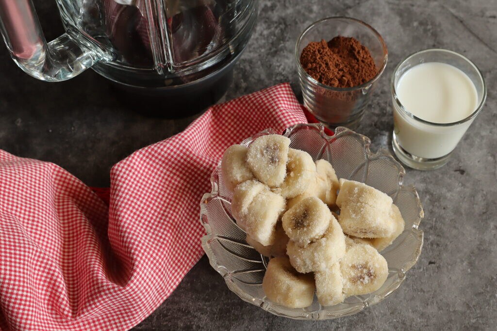 • Hace unos días puse en el congelador plátanos pelados y cortados en rodajas más o menos irregulares, hoy los he utilizado para preparar el helado de plátano. Para este helado no hace falta heladera, basta simplemente con la batidora.
