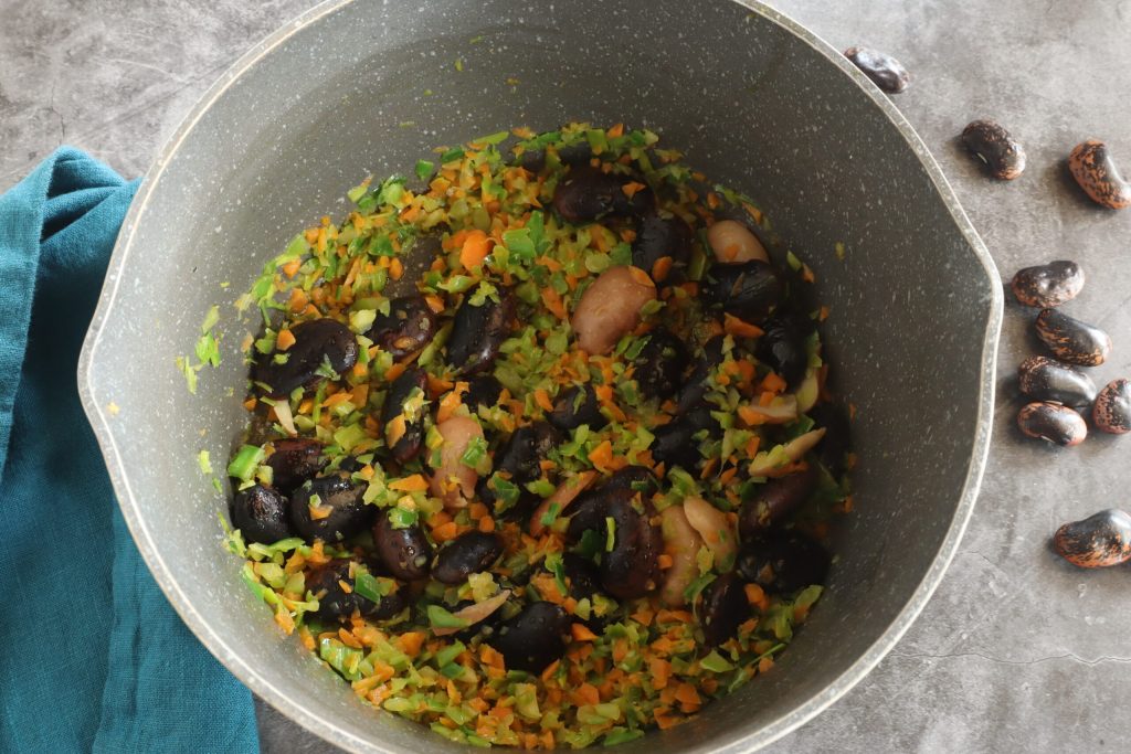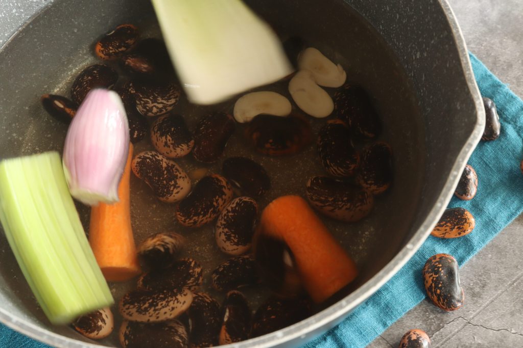 Al día siguiente, en la olla, puse en el agua la mitad del apio, la mitad de la zanahoria y la mitad de la chalota, las judías y las hice hervir a fuego lento con la tapa puesta durante una hora y 30 minutos.