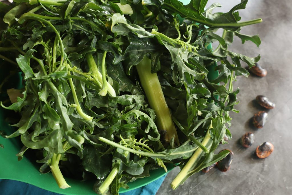 Pico finamente las coles y la escarola rizada y las añado a la cazuela.