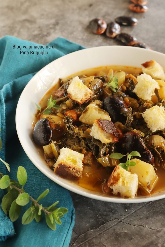 Judías Pavone con ribollita y no judías Purgatorio, las pequeñitas como siempre hago, pero he querido cambiar por las grandes, de hecho gigantes, Pavone. Este plato, en otoño o invierno, es un verdadero remedio y un primer plato reconfortante, pero os aseguro que también frío, en primavera por ejemplo, no desagrada en absoluto. A mi parecer, las verduras o las sopas no tienen estación, sólo cambia la temperatura a la hora de consumirlas: frías o calientes.