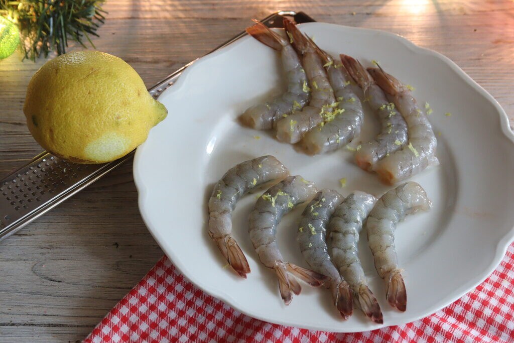 Lava los langostinos y quítales el caparazón, la cabeza y el intestino sacándolo con un palillo, dejando solo la colita. Condiméntalos con sal y pimienta, con perejil y aceite de oliva virgen extra y finalmente con cáscara y zumo de limón.