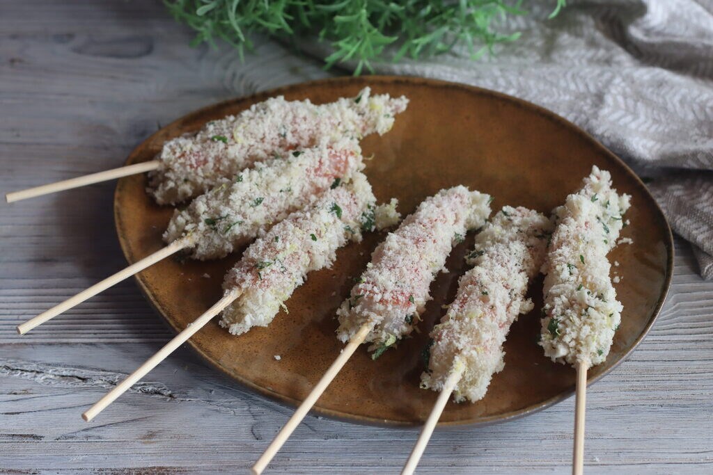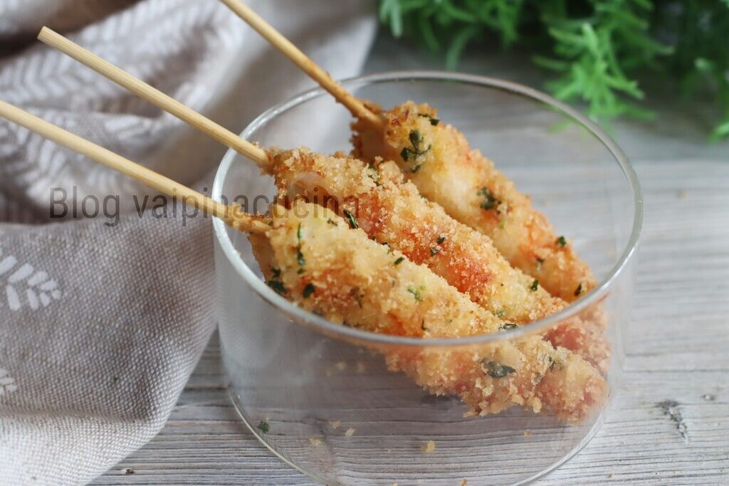 Langostinos empanados en brochetas, crujientes con el panko, un empanado típico de la cocina japonesa que he descubierto recientemente y que incluso preparo en casa. Para esta receta puedes comprarlo o seguir el enlace para leer todos los pasos y trucos para hacerlo fácilmente en casa. Normalmente cuando lo preparo, una vez que está bien frío lo aderezo con perejil y ajo finamente picados y cáscara de limón y lo guardo en un frasco en la nevera para tenerlo siempre listo. En mi blog encontrarás todos los detalles https://blog.giallozafferano.it/vaipinacucina