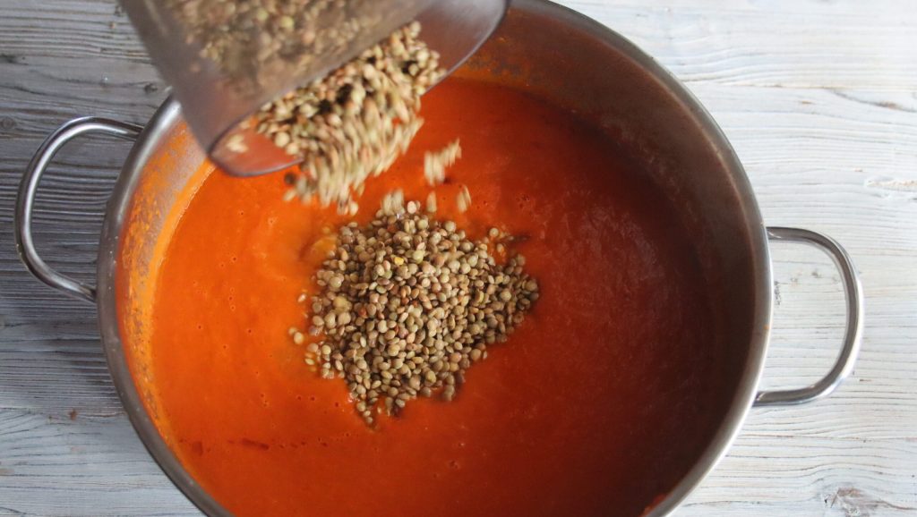 Añadir las lentejas lavadas un par de veces y cubrir con agua, si es posible caliente, ajustar de sal.