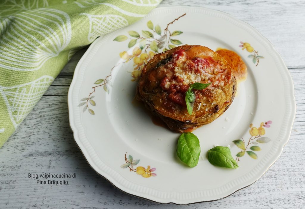 Mini parmigiana de berenjenas, ya porcionada, ¡fantástica! Todavía están tiernas, aprovechemos las berenjenas de final de temporada. Hoy os quiero proponer en lugar de la clásica parmigiana, dos variantes: la primera variante es esta, en lugar de mozzarella, he preferido probar el stracchino, diría más que satisfecha, ha dado a la parmigiana una cremosidad única. La segunda variante es la monoporción, práctica y simpática añado, ideal también para buffet, práctica de porcionar y agradable a la vista, del sabor no hablemos, ese ya lo conocéis. Probad la nueva versión con el stracchino.
