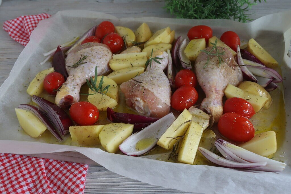 • En realidad hoy he elegido solo los muslos de pollo, siempre los más preferidos por todos. He lavado las patatas y las he cortado en gajos con toda la piel, los tomatitos los puse enteros, limpié las cebollas y las dividí en cuatro gajos.