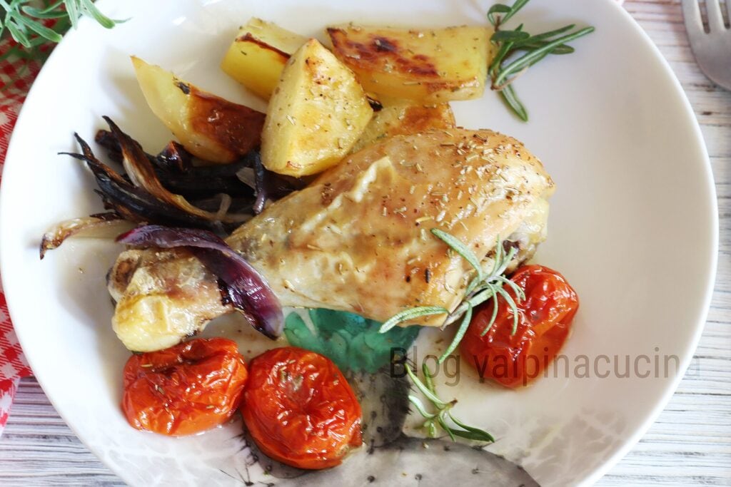 • En la bandeja con papel de horno, aliñé con sal y pimienta, romero fresco y seco, aceite de oliva virgen extra y vino blanco el pollo con las patatas, los tomatitos y las cebollas.