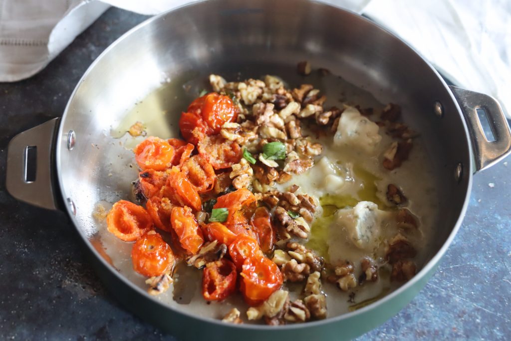 Los tomatitos están listos y los incorporo a las nueces tostadas y al gorgonzola ya fundido en la sartén.