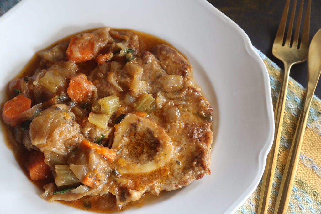 Ossobuco simple en blanco con muchas zanahorias y apio, vino blanco y cebollas super bueno y muy tierno. El ossobuco es un corte musculoso de hueso perforado del extremo del hombro y del muslo del ternero lechal, así que cocinándolo guisado se vuelve sabroso y sobre todo muy delicado. El ossobuco es un plato típico de Lombardía y es justo dejar que lo hagan ellos, es obvio que no me considero a su altura, pero simplemente quiero prepararlo a mi manera. Cocido con zanahorias y apio y perfumado con perejil y limón en gran cantidad antes de servirlo lo hará aún más tentador.