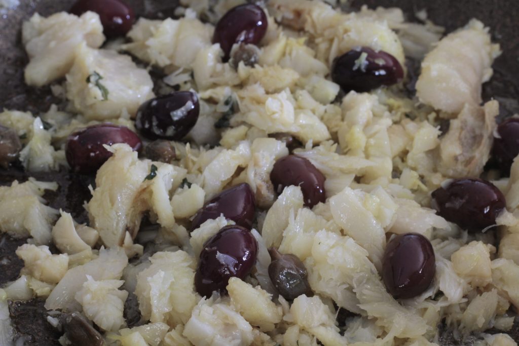 Quitad la piel del bacalao. Naturalmente hablamos de un pescado ya listo, desalado y remojado para cocinar que encontramos en la pescadería. Córtalo en trocitos y cocínalo en la sartén con dos cucharadas abundantes de aceite de oliva virgen extra y un diente de ajo. Diez minutos así, después añadid las aceitunas.