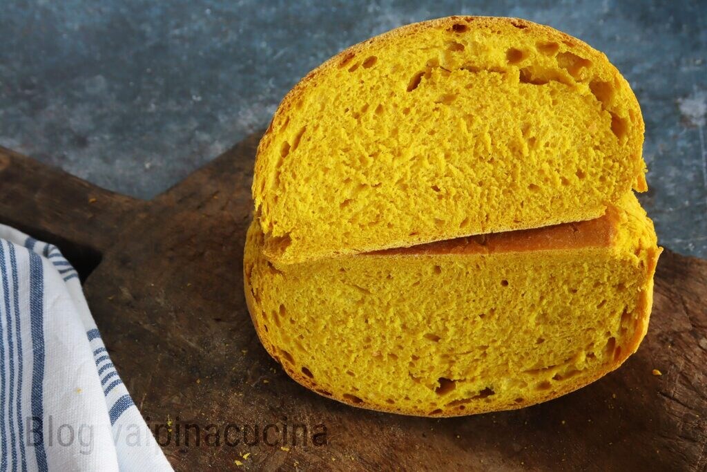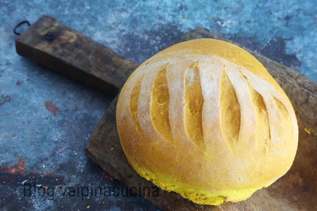 Pan con cúrcuma cuyo color ya te invita a probar una rebanada, o incluso dos o tres, tal vez con sal y aceite. Esta especia, la cúrcuma, se usa principalmente en la cocina india, tailandesa, de Oriente Medio y Asia. Sus orígenes son del sudeste asiático, es una planta pequeña y perenne, no supera el metro de altura, pero es la raíz, tan aromática y de color amarillo naranja, la que más interesa de la planta y se utiliza tanto fresca, que se encuentra exactamente en este período en invierno, como seca y luego reducida a polvo. Solo por el color amarillo intenso se utiliza la cúrcuma al igual que el azafrán para teñir tejidos.
