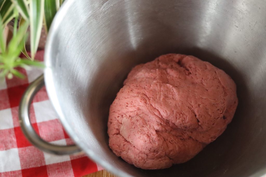Aquí está la masa coloreada del pan de remolacha roja tras 2 horas de levado.
