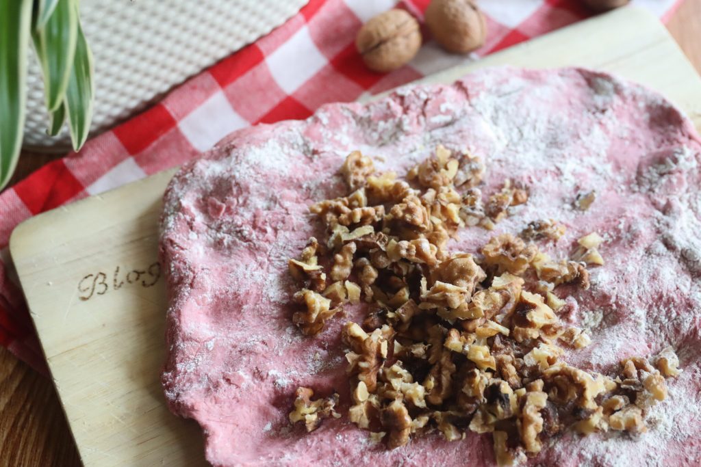 En este punto, estiro la masa del pan y añado en el centro las nueces.