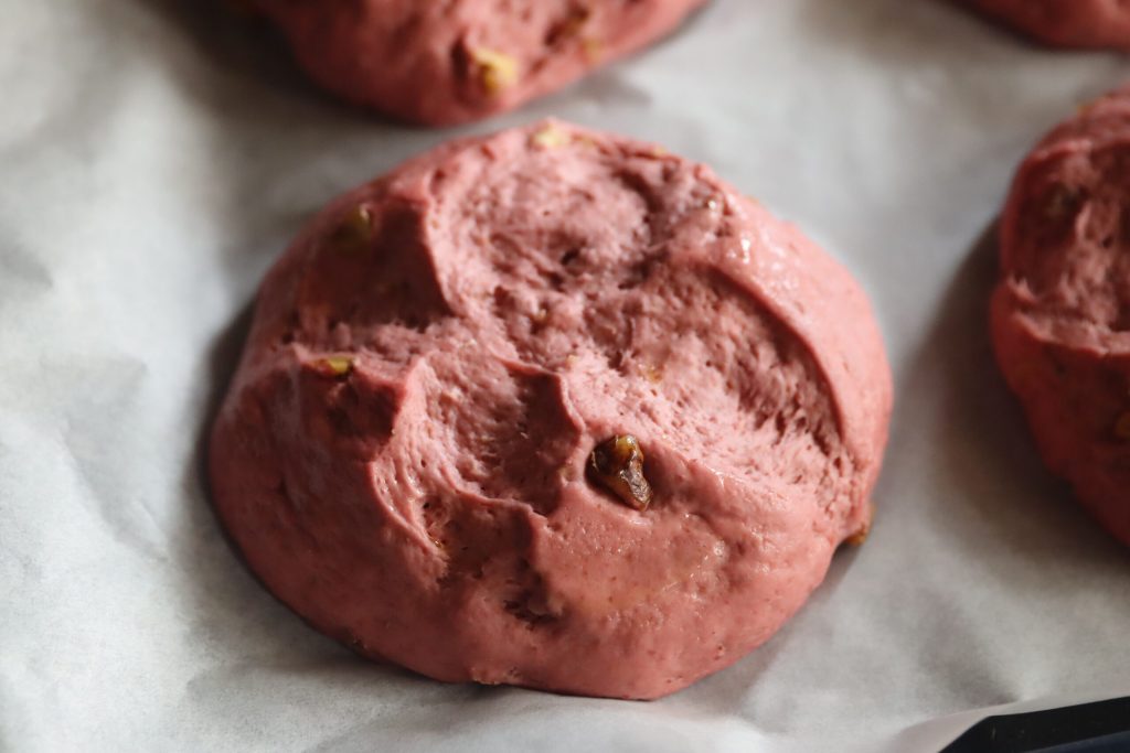 Este es el resultado después de media hora: el pan de remolacha roja y nueces ha vuelto a levar.