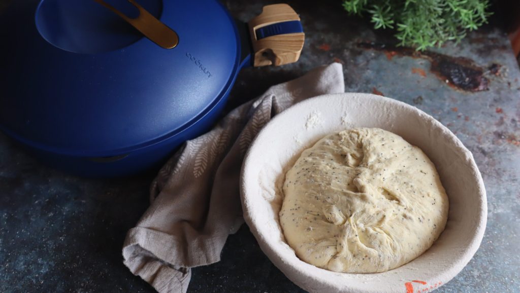 • Enciendo el horno a 225° y pongo mi sartén Cookut a calentar (sin asa, por supuesto, es muy cómodo porque es removible). Saco la sartén del horno y pongo el pan fermentado. Con el cortador especial hago varios cortes decorativos, cubro con la tapa y, ayudándome con el asa, horneo durante 30 minutos.