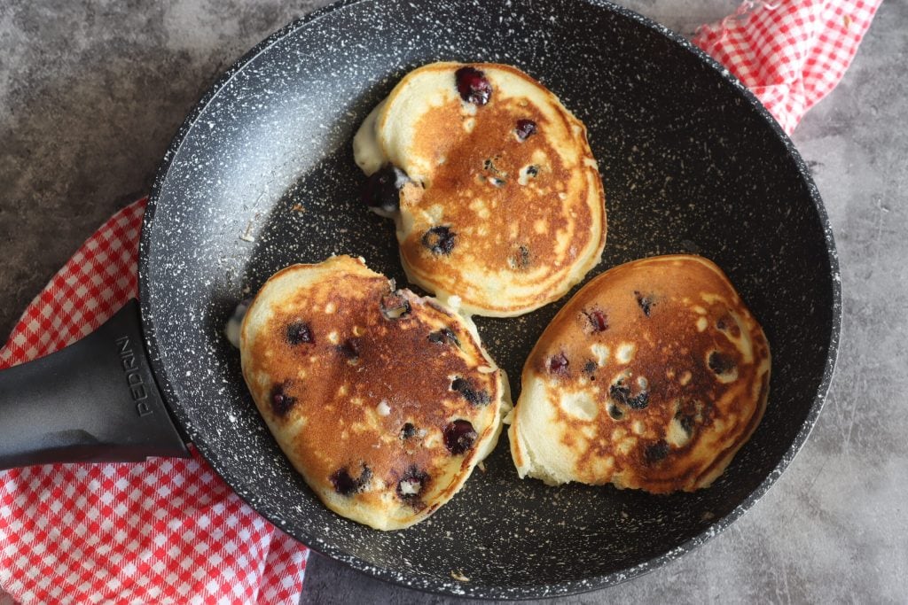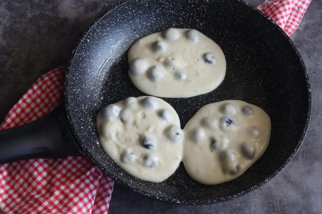 A veces dejo reposar mi mezcla de pancakes con arándanos en el frigorífico durante 15 minutos. Este paso no es realmente necesario, pero he notado que dejando reposar la mezcla, los pancakes salen mejor.