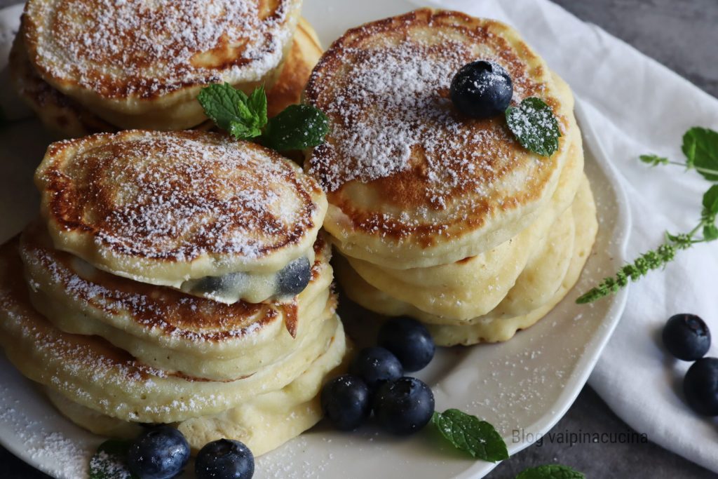 Pancakes con arándanos frescos que, ahora en alta montaña, se encuentran con facilidad, tanto los silvestres como los cultivados. Los arándanos negros, además de ser utilizados para preparaciones dulces y saladas en la cocina, son ya conocidos desde hace tiempo en la medicina fitoterapéutica y popular. Son realmente ricos en sustancias beneficiosas como los flavonoides, los taninos, las vitaminas y los antocianos, sustancias realmente potentes antioxidantes que protegen las células. Obviamente no solo: controlan la glucemia y tienen acciones antiinflamatorias. Lo bueno de los arándanos es que se pueden consumir frescos o secos, congelados o en forma de mermeladas, helados o dulces en general. Cuando es temporada, justamente ahora, los uso gustosamente y frecuentemente para mis pancakes. A propósito, todos tenemos la idea de que los pancakes son americanos o ingleses, pero en realidad su origen es mucho más antiguo, incluso griego.