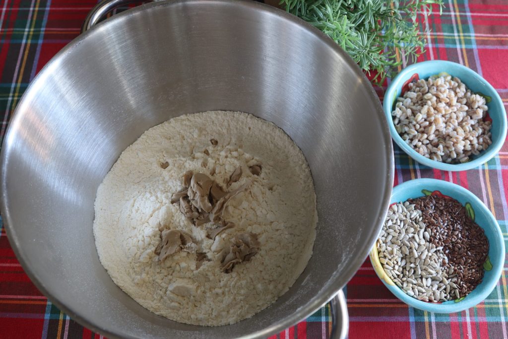 Para preparar los panecillos de 4 cereales utilizo la espelta cocida que quedó del día anterior, sin aderezo, de mi ensalada de espelta. En la amasadora pongo inmediatamente la harina y desmenuzo la levadura fresca. Comienzo a mezclar y añado el resto de los ingredientes: la espelta, las semillas de lino, las semillas de girasol y, para aromatizar, las semillas de anís. Añado el agua y la sal.