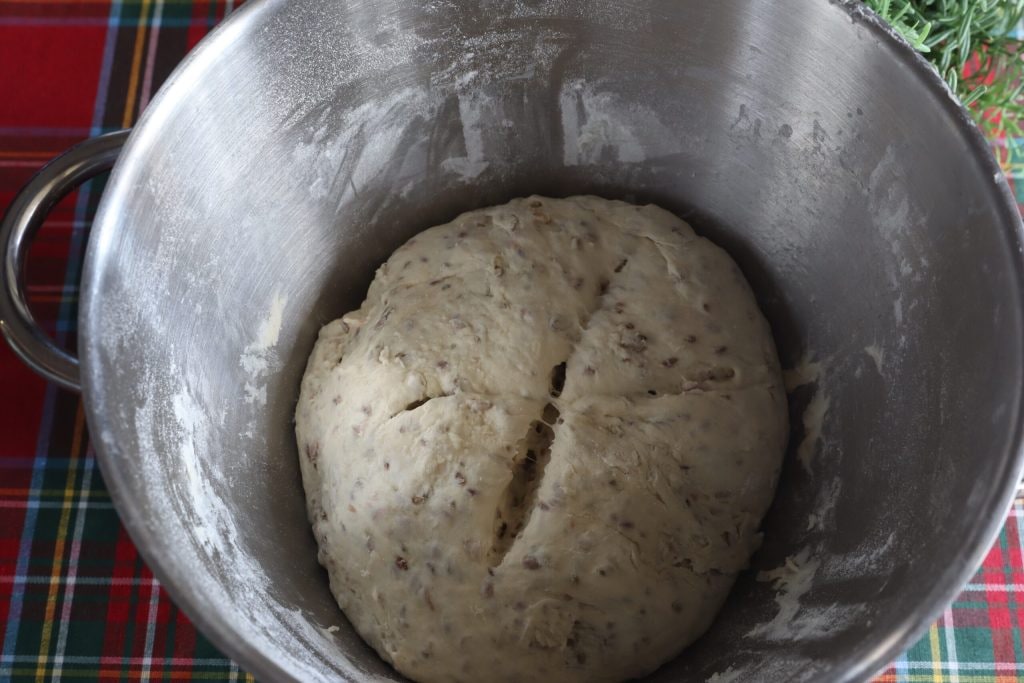 Pongo en marcha la amasadora y dejo que funcione suavemente durante 10 minutos. Directamente en la amasadora cubro y dejo que la masa duplique su tamaño durante al menos dos horas.