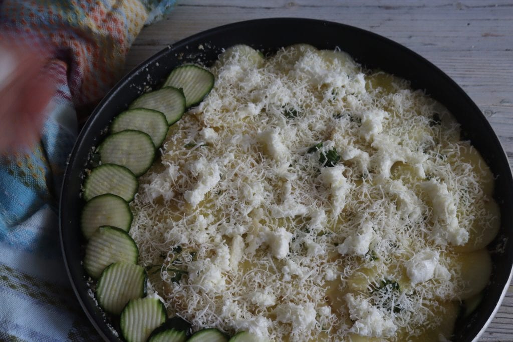 Última capa: termino con los calabacines, los mismos condimentos y concluyo con un puñado de pan rallado y parmesano.