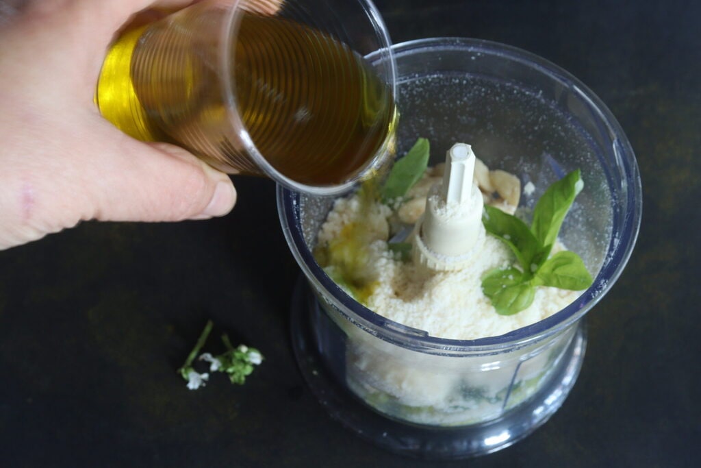 • El limón exprimido y la cáscara rallada, el aceite y la albahaca, la menta y el ajo, la sal con el queso parmesano rallado y las almendras peladas.