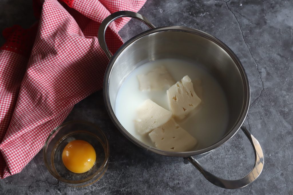 Derritan el taleggio en la cacerola con la leche y añadan la yema de huevo.