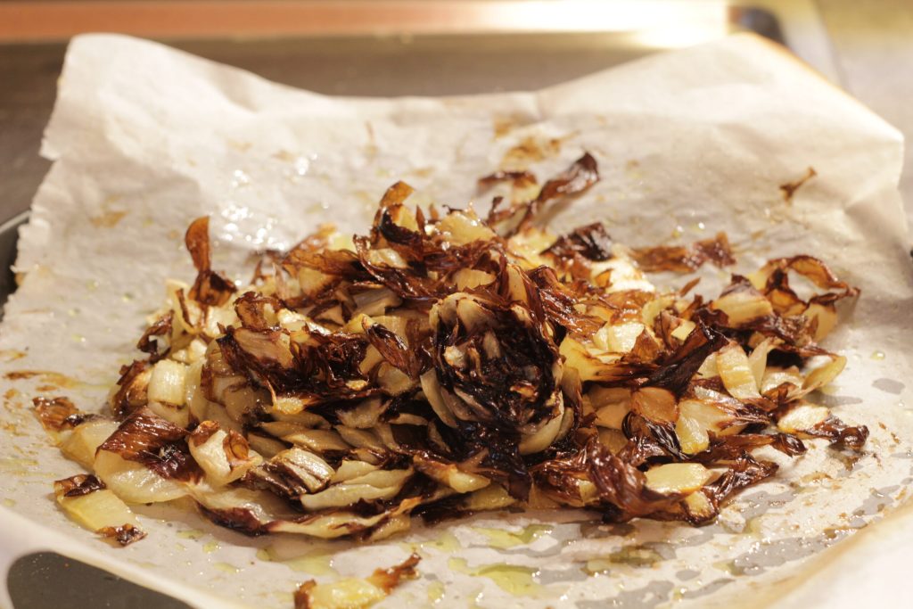 Corto el radicchio en rodajas finas, lo condimento con sal y aceite de oliva virgen extra, lo horneo durante 15 minutos a 190°