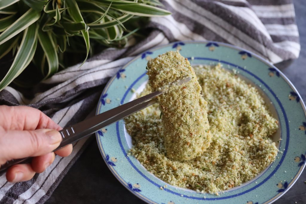 La giro varias veces para que se pegue la mayor cantidad posible de pan rallado aromatizado.