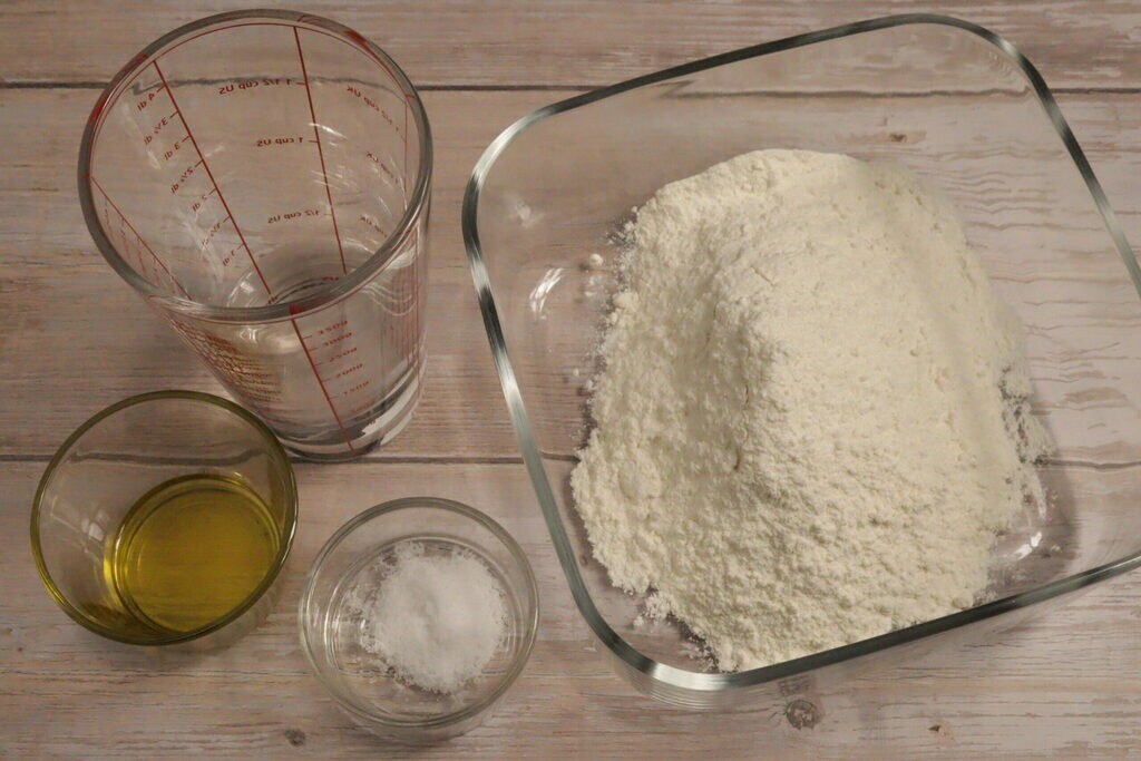 • Agrega el aceite de oliva virgen extra a la harina en un recipiente, pero también puedes hacerlo en la tabla de amasar.