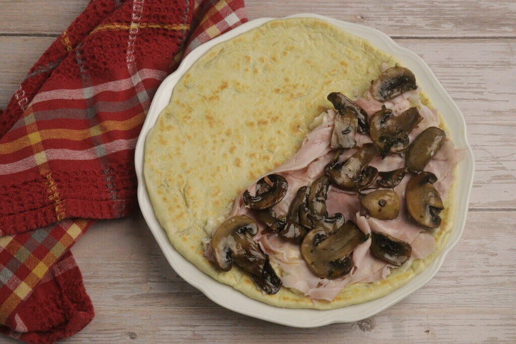 • Cierra a la mitad la piadina con gorgonzola, champiñones y jamón cocido y déjala durante unos minutos más en la parrilla caliente volteándola un par de veces.