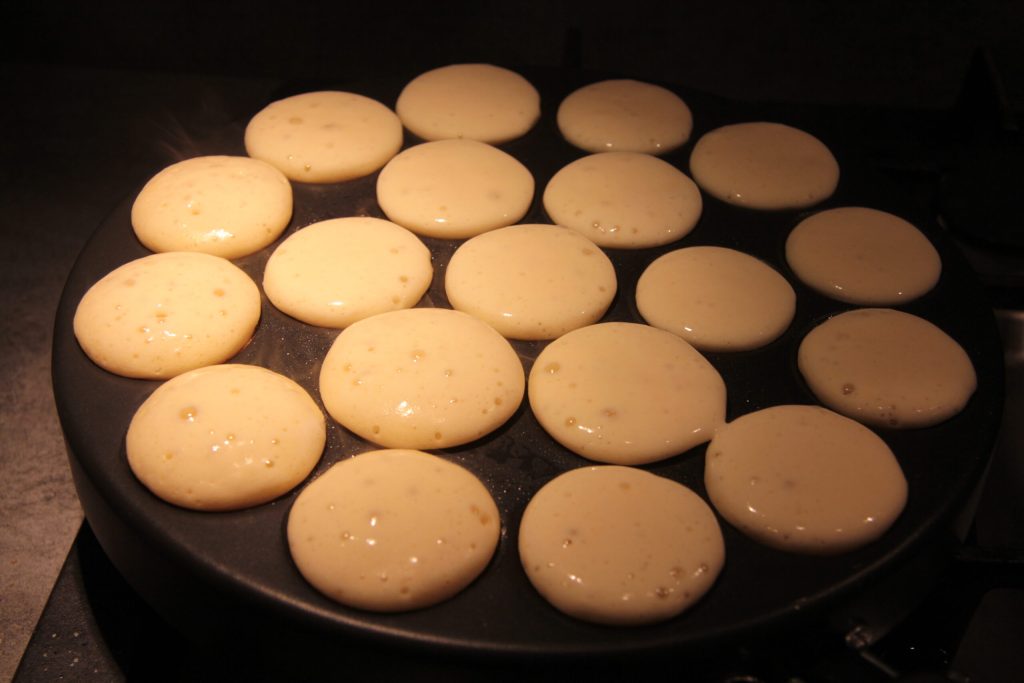 Pon a calentar la poffertjespan, (alternativamente una plancha de hierro fundido o sartén antiadherente va bien igual) con un biberón para almíbar vierte una pequeña cantidad de masa sin salir del borde.