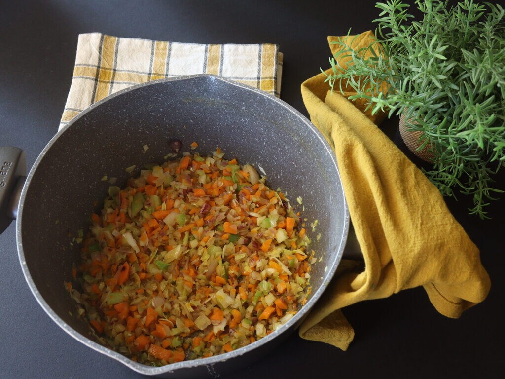 En la cacerola con el aceite hago dorar los aromas: cebolla, zanahoria, apio, puerro y chalote todo cortado súper fino, me he ayudado con la picadora manual.