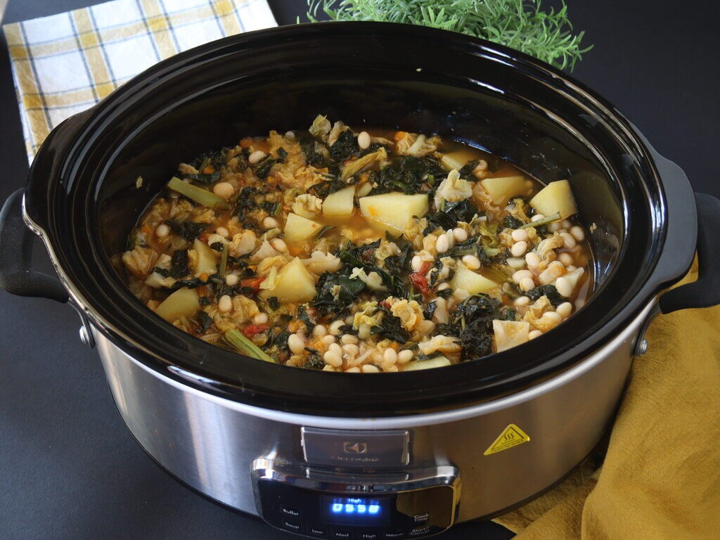 Ribollita en Slow Cooker para un sabor diría único, las verduras cocidas con el método de baja temperatura y cocción lenta adquieren un sabor antiguo como el que preparaban las abuelas, las sopas en cazuelas de barro cocinándolas con el fuego de la chimenea y durante toda la tarde hasta la cena. Ya había preparado previamente la Ribollita toscana, buenísima y laboriosa, siempre vale la pena comprometerse una mañana entera para prepararla, pero debo decir que esta la ha superado con creces por su sabor.