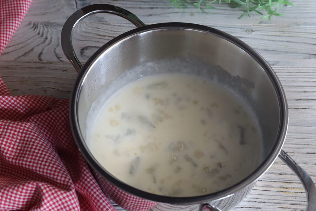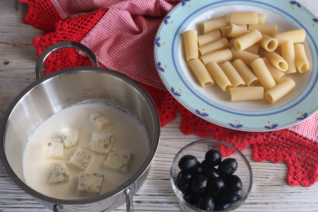 • En el cazo pongo la nata con el gorgonzola cortado en trozos y lo dejo fundir suavemente con el fuego al mínimo. Cuando el gorgonzola está completamente fundido, apago y añado la crema de aceitunas.